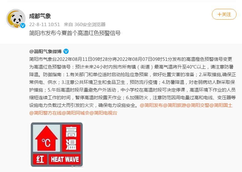 摘要:简阳市气象台2022年08月11日09时28分将2022年08月07日09时51分发布的高温橙色预警信号变更为高温红色预警信号:预计未来24小时内我市所有镇(街道)最高气温将升至40℃以上,请注意防暑