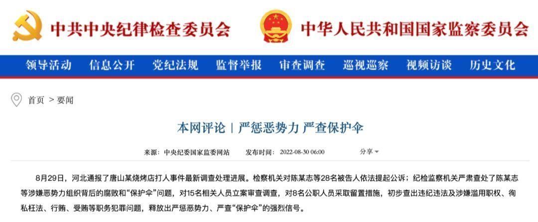 8月29日,河北通报了唐山某烧烤店打人事件最新调查处理进展。检察机关对陈某志等28名被告人依法提起公诉;纪检监察机关严肃查处了陈某志等涉嫌恶势力组织背后的腐败和“保护伞”问题,对15名相关人员立案审查调查,对8名公职人员采取留置措施,初步查出违纪违法及涉嫌滥用职权、徇私枉法、行贿、受贿等职务犯罪问题,释放出严惩恶势力、严查“保护伞”的强烈信号。